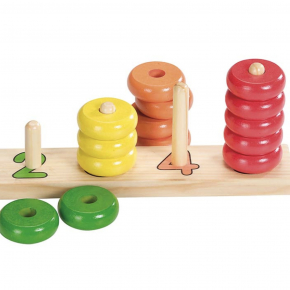 Children insert a few discs in a row in the back slot and then with each new one inserted, a disc slides out in the front, falling onto a peg.